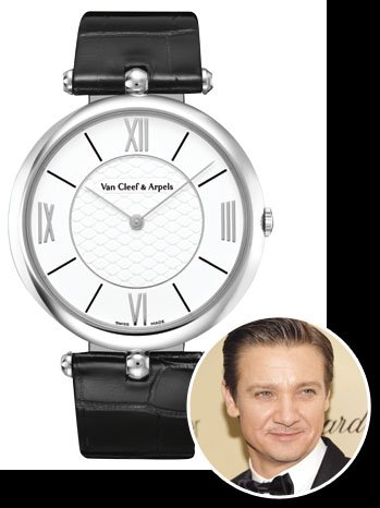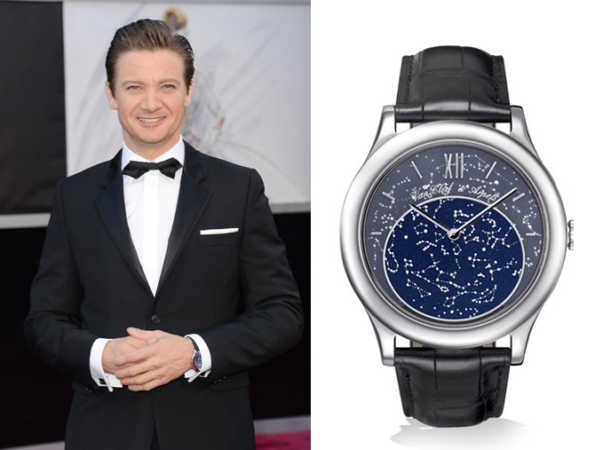 В стиле одежды Реннера присутствует настоящий художественный вкус. Где бы ни появился актер, его имидж всегда становится предметом восхищенных обсуждений коллег, поклонников и журналистов. Так, например, на вручении Оскара в 2013 году он вызвал ажиотаж своим элегантным костюмом от Dior Homme и наручными часами ювелирного дома Van Cleef & Arpels ограниченной серии выпуска. Это уникальное люксовое изделие, выполненное из золота и драгоценных камней, в очередной раз подчеркнуло статус и достаток своего обладателя. Особенной изюминкой часов являются вращающийся на 365 дней звездный диск, индикаторы даты и месяца с тыльной стороны корпуса и циферблат, инкрустированный белыми багетными бриллиантами.